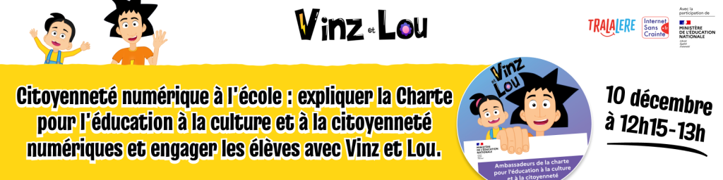 Le 10 décembre 2025, de 12h15 à 13h, Tralalere et Internet Sans Crainte proposent un webinaire gratuit de 45 minutes pour découvrir la mallette Vinz et Lou, un outil conçu pour aider enseignants et référents numériques à sensibiliser les élèves à la culture et à la citoyenneté numériques.