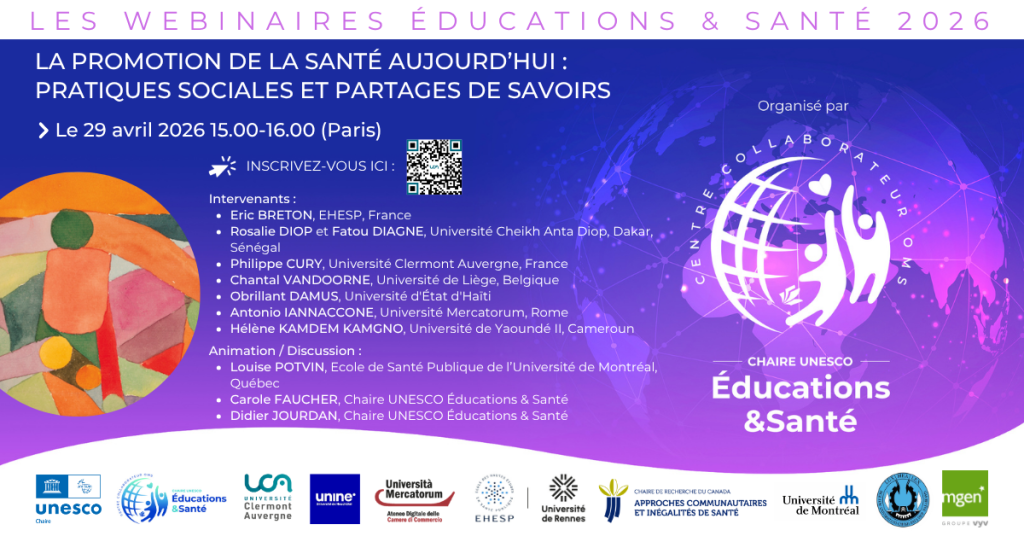 « Partager les savoirs de façon organisée et cohérente pour faire vivre la communauté mondiale de tous ceux et toutes celles qui s’intéressent à l’éducation et à la santé des enfants et des jeunes ».  Tel est l’objectif du programme de webinaires proposés par la Chaire UNESCO et Centre collaborateur OMS « ÉducationS & Santé » en partenariat avec les principales organisations internationales et un réseau de 70 universités. L’originalité de ce programme de partage de connaissance tient à la fois à :